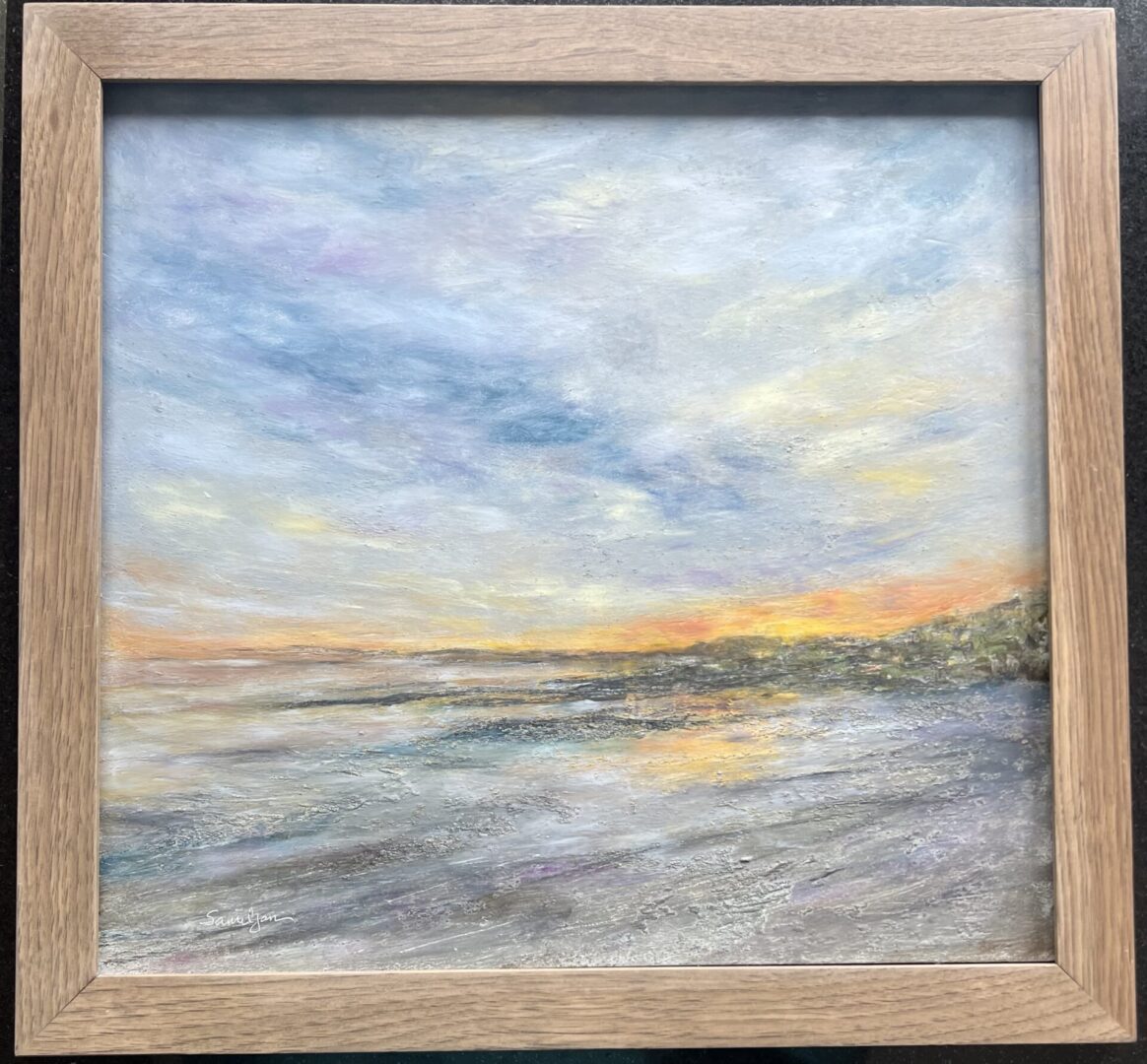 Wood frames that were originally sample door front panels have enhanced the presentation of these paintings. Many of them have been sanded and varnished to expose the natural wood, elevating the aesthetic.